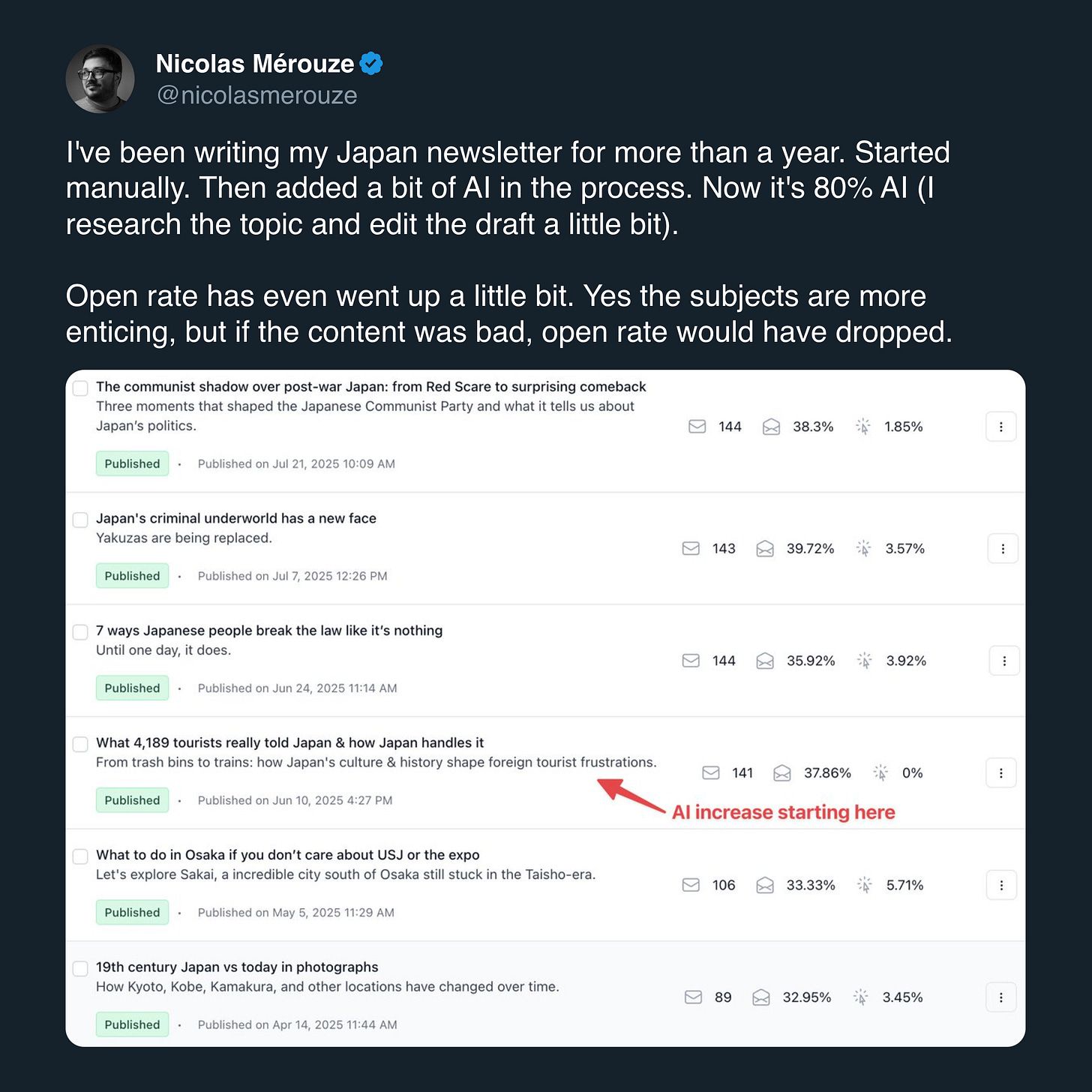 Newsletter generation: I’ve now switched to using mostly AI for my newsletter about Japan. I’m researching the topic to find the right angle and good sources, then edit a bit manually at the end. That’s it. I don’t struggle with the publishing schedule now.